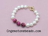 Fashion pearl bracelet: 9mm - 10mm potato white freshwater pearls & 10mm round red tiger eye beaded bracelet finished with copper spring ring clasp (Style No.5)
