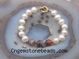 Details: Fashion pearl bracelet: 9mm - 10mm potato white freshwater pearls & 10mm round botswana agate beaded bracelet finished with copper spring ring clasp (Style No.5) Item: CFB1032 Material: 9-10mm potato white freshwater pearls 10mm round botswana agate beads 2*5mm copper spacers (No.4) Color: See image Style: No.1-No.3: Stretchy No.4-No.6: Hand-knotted (you can choose different style, spacer & clasp. if you like other style, clasp, spacer or other quality/size potato white freshwater pearls we don't show, please contact us before you placing order) Length (inch): Approx 7.5 inch (Default) You can choose 6.5”; 7”; 7.5”; 8”; 8.5”; 9” or 9.5”