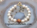 Details: Fashion pearl bracelet: 9mm - 10mm potato white freshwater pearls & 12mm round picasso jasper beaded bracelet finished with copper spring ring clasp (Style No.4) Item: CFB1068 Material: 9-10mm potato white freshwater pearls 12mm round picasso jasper beads 2*5mm copper spacers (No.4) Color: See image Style: No.1-No.3: Stretchy No.4-No.6: Hand-knotted (you can choose different style, spacer & clasp. if you like other style, clasp, spacer or other quality/size potato white freshwater pearls we don't show, please contact us before you placing order) Length (inch): Approx 7.5 inch (Default) You can choose 6.5”; 7”; 7.5”; 8”; 8.5”; 9” or 9.5”