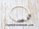Details: Fashion pearl bracelet: 6mm-7mm/7mm-8mm potato white freshwater pearls & 8mm round Botswana agate beaded stretchy bracelet jewelry Item: CFB607 Material: potato white freshwater pearls 8mm Botswana agate 1.5*4mm copper spacers Color: See image Style: No.1: 6-7mm potato white freshwater pearls (Default) No.2: 7-8mm potato white freshwater pearls (you can choose different spacer & style) Length (inch): Approx 7.5 inch (Default) You can choose 6.5”; 7”; 8”; 8.5”; 9” or 9.5”