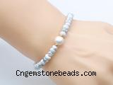 Details: Fashion gemstone & pearl bracelet: 4*6mm faceted rondelle white howlite & 10-11mm potato white freshwater pearl stretchy bracelet jewelry Item: CFB700 Material: 4*6mm faceted rondelle white howlite 10-11mm potato white freshwater pearls 1.5*4mm copper spacers (you can choose different spacer & style) Color: See image Length (inch): Approx 7.5 inch (Default) You can choose 6.5”; 7”; 8”; 8.5”; 9” or 9.5”
