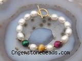 Details: Fashion pearl bracelet: 9mm - 10mm rice white freshwater pearls & 10mm round mixed tiger eye beaded bracelet finished with copper OT clasp (Style No.6) Item: CFB982 Material: 9-10mm rice white freshwater pearls 10mm round mixed tiger eye beads 1.5*4mm copper spacers (No.2) Color: See image Style: No.1-No.3: Stretchy No.4-No.6: Hand-knotted (you can choose different style, spacer & clasp. if you like other style, clasp, spacer or other quality/size rice white freshwater pearls we don't show, please contact us before you placing order) Length (inch): Approx 7.5 inch (Default) You can choose 6.5”; 7”; 7.5”; 8”; 8.5”; 9” or 9.5”