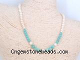 Details: Fashion pearl necklace: 5mm - 6mm potato white freshwater pearls & amazonite beaded necklace finished with copper lobster clasp Item: CFN107 Material: 5-6mm, 8-9mm & 10-11mm potato white freshwater pearls 6mm & 8mm round amazonite 1.5*4mm copper spacers Copper lobster clasp(#1) (you can choose different spacer & clasp, if you like sterling silver clasp or other clasp we don't show, please contact us before you placing order) Color: See image Style: No.1: Non-knotted (Default) No.2: Hand-knotted Length (inch): Approx 16 inch (Default, Include the clasp, but not including Tail Chain) You can choose 17”; 18”; 19”; 20”; 22” or 24”