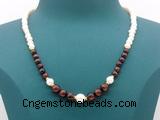 Details: Fashion pearl necklace: 5mm - 6mm potato white freshwater pearls & red tiger eye beaded necklace finished with copper lobster clasp Item: CFN117 Material: 5-6mm, 8-9mm & 10-11mm potato white freshwater pearls 6mm & 8mm round red tiger eye 1.5*4mm copper spacers Copper lobster clasp(#3) (you can choose different spacer & clasp, if you like sterling silver clasp or other clasp we don't show, please contact us before you placing order) Color: See image Style: No.1: Non-knotted (Default) No.2: Hand-knotted Length (inch): Approx 16 inch (Default, Include the clasp, but not including Tail Chain) You can choose 17”; 18”; 19”; 20”; 22” or 24”