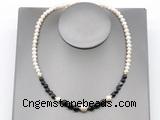 Details: Fashion pearl necklace: 5mm - 6mm potato white freshwater pearls & black banded agate beaded necklace finished with copper lobster clasp Item: CFN127 Material: 5-6mm, 8-9mm & 10-11mm potato white freshwater pearls 6mm & 8mm round black banded agate 1.5*4mm copper spacers Copper lobster clasp(#3) (you can choose different spacer & clasp, if you like sterling silver clasp or other clasp we don't show, please contact us before you placing order) Color: See image Style: No.1: Non-knotted (Default) No.2: Hand-knotted Length (inch): Approx 16 inch (Default, Include the clasp, but not including Tail Chain) You can choose 17”; 18”; 19”; 20”; 22” or 24”