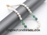 Details: Fashion pearl necklace: 9mm - 10mm rice white freshwater pearls & green banded agate beaded necklace finished with copper spring ring clasp Item: CFN309 Material: 9-10mm rice white freshwater pearls 10mm round green banded agate beads 1.5*4mm copper spacers (No.2) 11mm copper spring ring clasp (you can choose different spacer & clasp, if you like sterling silver clasp, other clasp or better quality rice white freshwater pearls we don't show, please contact us before you placing order) Color: See image Style: No.1: Non-knotted (Default) No.2: Hand-knotted Length (inch): Approx 16 inch (16-17”, Default) You can choose 17”(17-18”); 18”(18-19”); 19”(19-20”); 20”(20-21”); 22”(22-23”) or 24”(24-25”)