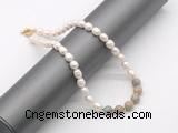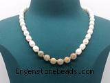 Details: Fashion pearl necklace: 16 - 24 inches 9mm - 10mm rice white freshwater pearls & 10mm round serpentine jasper beaded necklace finished with copper spring ring clasp Item: CFN457 Material: 9-10mm rice white freshwater pearls 10mm round serpentine jasper beads 1.5*4mm copper spacers (No.2) 11mm copper spring ring clasp (you can choose different spacer & clasp, if you like sterling silver clasp, other clasp or better quality rice white freshwater pearls we don't show, please contact us before you placing order) Color: See image Style: No.1: Non-knotted (Default) No.2: Hand-knotted Length (inch): Approx 16 inch (16-17”, Default) You can choose 17”(17-18”); 18”(18-19”); 19”(19-20”); 20”(20-21”); 22”(22-23”) or 24”(24-25”)