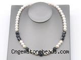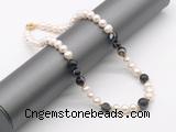 Details: Fashion pearl necklace: 16 - 24 inches 9mm - 10mm potato white freshwater pearls & black banded agate beaded necklace finished with copper spring ring clasp Item: CFN525 Material: 9-10mm potato white freshwater pearls 10mm & 12mm round black banded agate beads 2*5mm copper spacers (No.4) 11mm copper spring ring clasp (you can choose different spacer & clasp, if you like sterling silver clasp, other clasp or better quality potato white freshwater pearls we don't show, please contact us before you placing order) Color: See image Style: No.1: Non-knotted (Default) No.2: Hand-knotted Length (inch): Approx 16 inch (16-17”, Default) You can choose 17”(17-18”); 18”(18-19”); 19”(19-20”); 20”(20-21”); 22”(22-23”) or 24”(24-25”)
