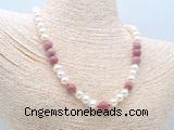 Details: Fashion pearl necklace: 16 - 24 inches 9mm - 10mm potato white freshwater pearls & pink wooden jasper beaded necklace finished with copper spring ring clasp Item: CFN553 Material: 9-10mm potato white freshwater pearls 10mm & 12mm round pink wooden jasper beads 2*5mm copper spacers (No.4) 11mm copper spring ring clasp (you can choose different spacer & clasp, if you like sterling silver clasp, other clasp or better quality potato white freshwater pearls we don't show, please contact us before you placing order) Color: See image Style: No.1: Non-knotted (Default) No.2: Hand-knotted Length (inch): Approx 16 inch (16-17”, Default) You can choose 17”(17-18”); 18”(18-19”); 19”(19-20”); 20”(20-21”); 22”(22-23”) or 24”(24-25”)