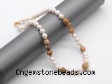 Details: Fashion pearl necklace: 16 - 24 inches 9mm - 10mm potato white freshwater pearls & picture jasper beaded necklace finished with copper spring ring clasp Item: CFN555 Material: 9-10mm potato white freshwater pearls 10mm & 12mm round picture jasper beads 2*5mm copper spacers (No.4) 11mm copper spring ring clasp (you can choose different spacer & clasp, if you like sterling silver clasp, other clasp or better quality potato white freshwater pearls we don't show, please contact us before you placing order) Color: See image Style: No.1: Non-knotted (Default) No.2: Hand-knotted Length (inch): Approx 16 inch (16-17”, Default) You can choose 17”(17-18”); 18”(18-19”); 19”(19-20”); 20”(20-21”); 22”(22-23”) or 24”(24-25”)