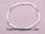 Details: Fashion pearl necklace: 16 - 24 inches 9mm - 10mm potato white freshwater pearls & aquamarine beaded necklace finished with copper spring ring clasp Item: CFN716 Material: 9-10mm potato white freshwater pearls 10mm/12mm round aquamarine beads 2*5mm copper spacers (No.4) 11mm copper spring ring clasp (you can choose different spacer & clasp, if you like sterling silver clasp, other clasp or better quality potato white freshwater pearls we don't show, please contact us before you placing order) Color: See image Style: No.1: Non-knotted (Default) No.2: Hand-knotted Length (inch): Approx 16 inch (16-17”, Default) You can choose 17”(17-18”); 18”(18-19”); 19”(19-20”); 20”(20-21”); 22”(22-23”) or 24”(24-25”)