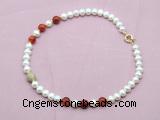 Details: Fashion pearl necklace: 16 - 24 inches 9mm - 10mm potato white freshwater pearls, red banded agate & 12mm zircon ball beaded necklace finished with copper spring ring clasp Item: CFN731 Material: 9-10mm potato white freshwater pearls 10mm/12mm round red banded agate beads 12mm zircon ball (No.2) 2*5mm copper spacers (No.4) 11mm copper spring ring clasp (you can choose different spacer, zircon ball & clasp, if you like sterling silver clasp, other clasp or better quality potato white freshwater pearls we don't show, please contact us before you placing order) Color: See image Style: No.1: Non-knotted (Default) No.2: Hand-knotted Length (inch): Approx 16 inch (16-17”, Default) You can choose 17”(17-18”); 18”(18-19”); 19”(19-20”); 20”(20-21”); 22”(22-23”) or 24”(24-25”)