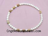 Details: Fashion pearl necklace: 16 - 24 inches 9mm - 10mm potato white freshwater pearls, picture jasper & 12mm zircon ball beaded necklace finished with copper spring ring clasp Item: CFN759 Material: 9-10mm potato white freshwater pearls 10mm/12mm round picture jasper beads 12mm zircon ball (No.2) 2*5mm copper spacers (No.4) 11mm copper spring ring clasp (you can choose different spacer, zircon ball & clasp, if you like sterling silver clasp, other clasp or better quality potato white freshwater pearls we don't show, please contact us before you placing order) Color: See image Style: No.1: Non-knotted (Default) No.2: Hand-knotted Length (inch): Approx 16 inch (16-17”, Default) You can choose 17”(17-18”); 18”(18-19”); 19”(19-20”); 20”(20-21”); 22”(22-23”) or 24”(24-25”)