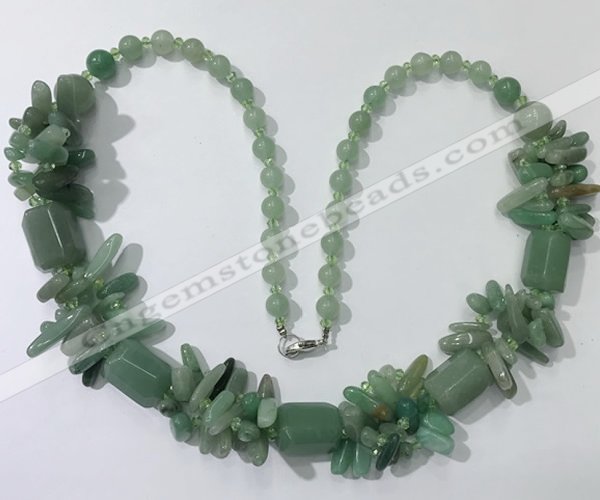 Green aventurine beaded necklace jewelry:8mm, 14mm round, 4*8mm - 6*25mm chips & 16*20mm faceted nuggets green aventurine gemstone beads,3*4mm faceted rondelle chinese crystal beads,ended with brass lobster clasp