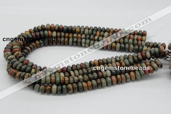 Details: 15.5 inches strand of 5*10mm rondelle picasso jasper beads wholesale Item: CPJ01 Material: picasso jasper Shape: rondelle Color: See image Size (mm): approx 5*10mm Length (inch): approx 15.5" per strand Quantity: approx 78 beads per strand Quantity Discount Pricing: 1 – 4: None 5 – 49: 95% 50 – 99: 90% 100+: 85% The listed price is for one strand beads |
