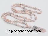 Details: Hand-knotted opal mala necklaces: 108 8mm/10mm round natural pink opal beads with 1 12mm guru bead and rose quartz pendant (you can choose different pendants) Item: GMN1468 Material: No.1(8mm: 108 8mm natural pink opal beads, 12mm guru bead & rose quartz pendant No.2(10mm: 108 10mm natural pink opal beads, 12mm guru bead & rose quartz pendant Color: See image Length (inch): Necklace length: No.1(8mm: approx 37 - 40 inches (Not including guru bead & pendant) No.2(10mm: approx 46 - 50 inches (Not including guru bead & pendant) Pendants: #1 - #8: approx 20*50mm – 22*55mm #9 - #23: approx 16*50mm – 16*55mm #24 - #30: approx 17*55mm – 17*58mm #31 - #39: approx 25*68mm – 25*70mm Quantity Discount Pricing: 1 – 4: None 5 – 49: 95% 50 – 99: 90% 100+: 85% This mala is available in both 8mm and 10mm beads, The listed price is for 1 piece 8mm mala necklace