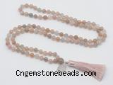 Details: Hand-knotted moonstone mala necklaces: 108 8mm/10mm round moonstone beads with 1 12mm guru bead and satin tassel & alloy charm (you can choose different tassels & charms) Item: GMN1805 Material: No.1(8mm: 108 8mm moonstone, 12mm guru bead, satin tassel & charm No.2(10mm: 108 10mm moonstone, 12mm guru bead, satin tassel & charm Color: See image Length (inch): Necklace length: No.1(8mm: approx 37 - 40 inches (Not including guru bead & charm) No.2(10mm: approx 46 - 50 inches (Not including guru bead & charm) Quantity Discount Pricing: 1 – 4: None 5 – 49: 95% 50 – 99: 90% 100+: 85% This mala is available in both 8mm and 10mm beads, The listed price is for 1 piece 8mm mala necklace