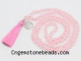 Details: Hand-knotted quartz mala necklaces: 108 8mm/10mm round matte rose quartz gemstone beads with 1 12mm guru bead and satin tassel & alloy charm (you can choose different tassels & charms) Item: GMN2035 Material: No.1(8mm: 108 8mm matte rose quartz beads, 12mm guru bead, satin tassel & charm No.2(10mm: 108 10mm matte rose quartz beads, 12mm guru bead, satin tassel & charm Color: See image Length (inch): Necklace length: No.1(8mm: approx 37 - 40 inches (Not including guru bead & tassel) No.2(10mm: approx 46 - 50 inches (Not including guru bead & tassel) Quantity Discount Pricing: 1 – 4: None 5 – 49: 95% 50 – 99: 90% 100+: 85% This mala is available in both 8mm and 10mm beads, The listed price is for 1 piece 8mm mala necklace