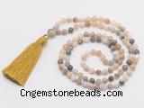 Details: Hand-knotted agate mala necklaces: 6mm round bamboo leaf agate gemstone beads with 1 10mm guru bead and satin tassel (you can choose different colors) Item: GMN275 Material: Bamboo leaf agate & Satin tassel Color: See image Length (inch): Necklace length: approx 28 - 31 inches(Not including guru bead & tassel) Tassel Lenght: 7cm Quantity Discount Pricing: 1 – 4: None 5 – 49: 95% 50 – 99: 90% 100+: 85% The listed price is for 1 piece mala necklace Each necklaces is handmade and hand-knotted with different gemstones. Please be aware that each necklace varies in stone pattern and color - Making it a truly one-of-a-kind, unique piece of jewelry.