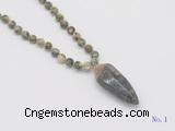 Details: Hand-knotted rhyolite mala necklaces: 108 8mm/10mm round rhyolite beads with grey opal pendant/12mm guru bead and grey opal pendant (you can choose different pendants, but there will be tiny different in shape & color, we will make the jewelry randomly according to our stock) Item: GMN4027 Material: No.1: 8mm: 108 8mm rhyolite beads & grey opal pendant 10mm: 108 10mm rhyolite beads & grey opal pendant No.2: 8mm: 108 8mm rhyolite beads, 12mm guru bead & grey opal pendant 10mm: 108 10mm rhyolite beads, 12mm guru bead & grey opal pendant Color: See image Length (inch): Necklace length: 8mm: approx 37 - 40 inches (Not including guru bead & pendant) 10mm: approx 46 - 50 inches (Not including guru bead & pendant) Pendants: approx 18*50mm – 25*60mm Quantity Discount Pricing: 1 – 4: None 5 – 49: 95% 50 – 99: 90% 100+: 85% This mala is available in both 8mm and 10mm beads, The listed price is for 1 piece 8mm mala necklace