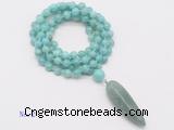 Details: Hand-knotted amazonite mala necklaces: 108 8mm/10mm round grade A amazonite beads with green aventurine pendant/12mm guru bead and green aventurine pendant (you can choose different pendants, but there will be tiny different in shape & color, we will make the jewelry randomly according to our stock) Item: GMN4085 Material: No.1: 8mm: 108 8mm amazonite beads & green aventurine pendant 10mm: 108 10mm amazonite beads & green aventurine pendant No.2: 8mm: 108 8mm amazonite beads, 12mm guru bead & green aventurine pendant 10mm: 108 10mm amazonite beads, 12mm guru bead & green aventurine pendant Color: See image Length (inch): Necklace length: 8mm: approx 37 - 40 inches (Not including guru bead & pendant) 10mm: approx 46 - 50 inches (Not including guru bead & pendant) Pendants: approx 18*50mm - 25*60mm Quantity Discount Pricing: 1 – 4: None 5 – 49: 95% 50 – 99: 90% 100+: 85% This mala is available in both 8mm and 10mm beads, The listed price is for 1 piece 8mm mala necklace