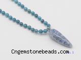 Details: Hand-knotted apatite mala necklaces: 108 8mm/10mm round apatite beads with blue spot stone pendant/12mm guru bead and blue spot stone pendant (you can choose different pendants, but there will be tiny different in shape & color, we will make the jewelry randomly according to our stock) Item: GMN4086 Material: No.1: 8mm: 108 8mm apatite beads & blue spot stone pendant 10mm: 108 10mm apatite beads & blue spot stone pendant No.2: 8mm: 108 8mm apatite beads, 12mm guru bead & blue spot stone pendant 10mm: 108 10mm apatite beads, 12mm guru bead & blue spot stone pendant Color: See image Length (inch): Necklace length: 8mm: approx 37 - 40 inches (Not including guru bead & pendant) 10mm: approx 46 - 50 inches (Not including guru bead & pendant) Pendants: approx 18*50mm - 25*60mm Quantity Discount Pricing: 1 – 4: None 5 – 49: 95% 50 – 99: 90% 100+: 85% This mala is available in both 8mm and 10mm beads, The listed price is for 1 piece 8mm mala necklace