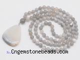 Details: Hand-knotted agate mala necklaces: 108 8mm/10mm round grey banded agate beads with agate pendant/12mm guru bead and agate pendant (you can choose different pendants, but there will be tiny different in shape & color, we will make the jewelry randomly according to our stock) Item: GMN4665 Material: No.1: 8mm: 108 8mm grey banded agate beads & agate pendant 10mm: 108 10mm grey banded agate beads & agate pendant No.2: 8mm: 108 8mm grey banded agate beads, 12mm guru bead & agate pendant 10mm: 108 10mm grey banded agate beads, 12mm guru bead & agate pendant Color: See image Length (inch): Necklace length: 8mm: approx 37 - 40 inches (Not including guru bead & pendant) 10mm: approx 46 - 50 inches (Not including guru bead & pendant) Quantity Discount Pricing: 1 – 4: None 5 – 49: 95% 50 – 99: 90% 100+: 85% This mala is available in both 8mm and 10mm beads, The listed price is for 1 piece 8mm mala necklace