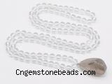 Details: Hand-knotted quartz mala necklaces: 108 8mm/10mm round white crystal beads with smoky quartz pendant (you can choose different pendants, but there will be tiny different in shape & color, we will make the jewelry randomly according to our stock) Item: GMN4800 Material: 8mm: 108 8mm white crystal beads & smoky quartz pendant 10mm: 108 10mm white crystal beads & smoky quartz pendant Color: See image Length (inch): Necklace length: 8mm: approx 37 - 40 inches (Not including pendant) 10mm: approx 46 - 50 inches (Not including pendant) Pendants: approx 18*35mm – 28*40mm Quantity Discount Pricing: 1 – 4: None 5 – 49: 95% 50 – 99: 90% 100+: 85% This mala is available in both 8mm and 10mm beads, The listed price is for 1 piece 8mm mala necklace