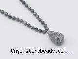 Details: Hand-knotted labradorite mala necklaces: 108 8mm/10mm round black labradorite beads with fossil jasper pendant/12mm guru bead and fossil jasper pendant (you can choose different pendants, but there will be tiny different in shape & color, we will make the jewelry randomly according to our stock) Item: GMN4934 Material: No.1: 8mm: 108 8mm black labradorite beads & fossil jasper pendant 10mm: 108 10mm black labradorite beads & fossil jasper pendant No.2: 8mm: 108 8mm black labradorite beads, 12mm guru bead & fossil jasper pendant 10mm: 108 10mm black labradorite beads, 12mm guru bead & fossil jasper pendant Color: See image Length (inch): Necklace length: 8mm: approx 37 - 40 inches (Not including guru bead & pendant) 10mm: approx 46 - 50 inches (Not including guru bead & pendant) Pendants: approx 18*35mm - 28*40mm Quantity Discount Pricing: 1 - 4: None 5 - 49: 95% 50 - 99: 90% 100+: 85% This mala is available in both 8mm and 10mm beads, The listed price is for 1 piece 8mm mala necklace