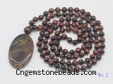 Details: Hand-knotted tiger eye mala necklaces: 108 8mm/10mm round grade AA red tiger eye beads with iron tiger pendant/12mm guru bead and iron tiger pendant (you can choose different pendants, but there will be tiny different in shape & color, we will make the jewelry randomly according to our stock) Item: GMN5070 Material: No.1: 8mm: 108 8mm red tiger eye beads & iron tiger pendant 10mm: 108 10mm red tiger eye beads & iron tiger pendant No.2: 8mm: 108 8mm red tiger eye beads, 12mm guru bead & iron tiger pendant 10mm: 108 10mm red tiger eye beads, 12mm guru bead & iron tiger pendant Color: See image Length (inch): Necklace length: 8mm: approx 37 - 40 inches (Not including guru bead & pendant) 10mm: approx 46 - 50 inches (Not including guru bead & pendant) Quantity Discount Pricing: 1 - 4: None 5 - 49: 95% 50 - 99: 90% 100+: 85% This mala is available in both 8mm and 10mm beads, The listed price is for 1 piece 8mm mala necklace