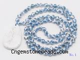 Details: Hand-knotted agate mala necklaces: 108 8mm/10mm round tibetan agate beads with white howlite pendant/12mm white crazy agate guru bead and white howlite pendant (you can choose different pendants, but there will be tiny different in shape & color, we will make the jewelry randomly according to our stock) Item: GMN5084 Material: No.1: 8mm: 108 8mm tibetan agate beads & white howlite pendant 10mm: 108 10mm tibetan agate beads & white howlite pendant No.2: 8mm: 108 8mm tibetan agate beads, 12mm sodalite guru bead & white howlite pendant 10mm: 108 10mm tibetan agate beads, 12mm sodalite guru bead & white howlite pendant Color: See image Length (inch): Necklace length: 8mm: approx 37 - 40 inches (Not including guru bead & pendant) 10mm: approx 46 - 50 inches (Not including guru bead & pendant) Quantity Discount Pricing: 1 - 4: None 5 - 49: 95% 50 - 99: 90% 100+: 85% This mala is available in both 8mm and 10mm beads, The listed price is for 1 piece 8mm mala necklace