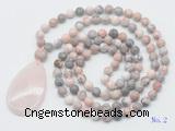 Details: Hand-knotted jasper mala necklaces: 108 8mm/10mm round pink zebra jasper beads with rose quartz pendant/12mm guru bead and rose quartz pendant (you can choose different pendants, but there will be tiny different in shape & color, we will make the jewelry randomly according to our stock) Item: GMN5088 Material: No.1: 8mm: 108 8mm pink zebra jasper beads & rose quartz pendant 10mm: 108 10mm pink zebra jasper beads & rose quartz pendant No.2: 8mm: 108 8mm pink zebra jasper beads, 12mm guru bead & rose quartz pendant 10mm: 108 10mm pink zebra jasper beads, 12mm guru bead & rose quartz pendant Color: See image Length (inch): Necklace length: 8mm: approx 37 - 40 inches (Not including guru bead & pendant) 10mm: approx 46 - 50 inches (Not including guru bead & pendant) Quantity Discount Pricing: 1 - 4: None 5 - 49: 95% 50 - 99: 90% 100+: 85% This mala is available in both 8mm and 10mm beads, The listed price is for 1 piece 8mm mala necklace