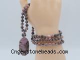 Details: Hand-knotted rhodonite mala necklaces: 108 8mm/10mm round rhodonite beads with rhodonite pendant/12mm guru bead and rhodonite pendant (you can choose different pendants, but there will be tiny different in shape & color, we will make the jewelry randomly according to our stock) Item: GMN5180 Material: No.1: 8mm: 108 8mm rhodonite beads & rhodonite pendant 10mm: 108 10mm rhodonite beads & rhodonite pendant No.2: 8mm: 108 8mm rhodonite beads, 12mm guru bead & rhodonite pendant 10mm: 108 10mm rhodonite beads, 12mm guru bead & rhodonite pendant Color: See image Length (inch): Necklace length: 8mm: approx 37 - 40 inches (Not including guru bead & pendant) 10mm: approx 46 - 50 inches (Not including guru bead & pendant) Pendants: approx 30*50mm Quantity Discount Pricing: 1 - 4: None 5 - 49: 95% 50 - 99: 90% 100+: 85% This mala is available in both 8mm and 10mm beads, The listed price is for 1 piece 8mm mala necklace