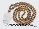 Details: Hand-knotted tiger eye mala necklaces: 108 8mm/10mm round grade AA yellow tiger eye beads with black rutilated quartz pendant/12mm guru bead and black rutilated quartz pendant (you can choose different pendants, but there will be tiny different in shape & color, we will make the jewelry randomly according to our stock) Item: GMN5184 Material: No.1: 8mm: 108 8mm yellow tiger eye beads & black rutilated quartz pendant 10mm: 108 10mm yellow tiger eye beads & black rutilated quartz pendant No.2: 8mm: 108 8mm yellow tiger eye beads, 12mm guru bead & black rutilated quartz pendant 10mm: 108 10mm yellow tiger eye beads, 12mm guru bead & black rutilated quartz pendant Color: See image Length (inch): Necklace length: 8mm: approx 37 - 40 inches (Not including guru bead & pendant) 10mm: approx 46 - 50 inches (Not including guru bead & pendant) Pendants: approx 35*55mm Quantity Discount Pricing: 1 - 4: None 5 - 49: 95% 50 - 99: 90% 100+: 85% This mala is available in both 8mm and 10mm beads, The listed price is for 1 piece 8mm mala necklace