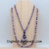 Details: Hand-knotted amethyst mala necklaces: 108 8mm/10mm round dogtooth amethyst beads with amethyst pendant/12mm guru bead and amethyst pendant (you can choose different pendants, but there will be tiny different in shape & color, we will make the jewelry randomly according to our stock) Item: GMN5199 Material: No.1: 8mm: 108 8mm dogtooth amethyst beads & amethyst pendant 10mm: 108 10mm dogtooth amethyst beads & amethyst pendant No.2: 8mm: 108 8mm dogtooth amethyst beads, 12mm guru bead & amethyst pendant 10mm: 108 10mm dogtooth amethyst beads, 12mm guru bead & amethyst pendant Color: See image Length (inch): Necklace length: 8mm: approx 37 - 40 inches (Not including guru bead & pendant) 10mm: approx 46 - 50 inches (Not including guru bead & pendant) Pendants: approx 30*50mm Quantity Discount Pricing: 1 – 4: None 5 – 49: 95% 50 – 99: 90% 100+: 85% This mala is available in both 8mm and 10mm beads, The listed price is for 1 piece 8mm mala necklace