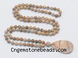 Details: Hand-knotted jasper mala necklaces: 108 8mm/10mm round picture jasper beads with picture jasper pendant/12mm guru bead and picture jasper pendant (you can choose different pendants, but there will be tiny different in shape & color, we will make the jewelry randomly according to our stock) Item: GMN5223 Material: No.1: 8mm: 108 8mm picture jasper beads & picture jasper pendant 10mm: 108 10mm picture jasper beads & picture jasper pendant No.2: 8mm: 108 8mm picture jasper beads, 12mm guru bead & picture jasper pendant 10mm: 108 10mm picture jasper beads, 12mm guru bead & picture jasper pendant Color: See image Length (inch): Necklace length: 8mm: approx 37 - 40 inches (Not including guru bead & pendant) 10mm: approx 46 - 50 inches (Not including guru bead & pendant) Pendants: approx 35*55mm Quantity Discount Pricing: 1 – 4: None 5 – 49: 95% 50 – 99: 90% 100+: 85% This mala is available in both 8mm and 10mm beads, The listed price is for 1 piece 8mm mala necklace