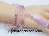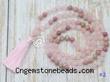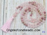 Details: Hand-knotted quartz mala necklaces: 108 8mm/10mm round rose quartz & pink wooden jasper beads & 12mm faceted rose quartz guru bead with tassel/tassel & alloy charm (you can choose different tassel & charm) Item: GMN6351 Material: No.1: 8mm/10mm rose quartz, pink wooden jasper beads, 12mm faceted rose quartz guru bead And tassel No.2: 8mm/10mm rose quartz, pink wooden jasper beads, 12mm faceted rose quartz guru bead And tassel & charm Color: See image Length (inch): Necklace length: 8mm: approx 37 - 40 inches (Not including guru bead & tassel) 10mm: approx 46 - 50 inches (Not including guru bead & tassel) Quantity Discount Pricing: 1 – 4: None 5 – 49: 95% 50 – 99: 90% 100+: 85% This mala is available in both 8mm and 10mm beads, The listed price is for 1 piece 8mm mala necklace