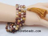 Details: Hand-knotted mookaite mala necklaces: 108 8mm/10mm round mookaite beads with 1 5*13mm alloy bead and satin tassel (you can choose different colors) Item: GMN637 Material: No.1: 108 8mm mookaite beads, alloy bead & satin tassel No.2: 108 10mm mookaite beads, alloy bead & satin tassel Color: See image Length (inch): Necklace length: No.1(8mm: approx 38 - 41 inches (Not including guru bead & tassel) No.2(10mm: approx 47 - 50 inches (Not including guru bead & tassel) Tassel Lenght: 7cm Quantity Discount Pricing: 1 – 4: None 5 – 49: 95% 50 – 99: 90% 100+: 85% This mala is available in both 8mm and 10mm beads, The listed price is for 1 piece 8mm mala necklace