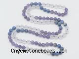 Details: Hand-knotted quartz mala necklaces: 108 8mm/10mm round matte amethyst, matte white crystal & matte lapis lazuli gemstone beaded necklaces Item: GMN6401 Material: No.1(8mm: matte amethyst, matte white crystal & matte lapis lazuli beads No.2(10mm: matte amethyst, matte white crystal & matte lapis lazuli beads Color: See image Length (inch): Necklace length: 8mm: approx 37 - 40 inches 10mm: approx 46 - 50 inches Quantity Discount Pricing: 1 – 4: None 5 – 49: 95% 50 – 99: 90% 100+: 85% This mala is available in both 8mm and 10mm beads, The listed price is for 1 piece 8mm mala necklace