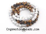 Details: Meditation Jewelry: 108 8mm white howlite & yellow tiger eye chakra gemstone beads healing gemstone necklace/wrap bracelet for yoga/prayer Item: GMN7086 Material: 8mm white howlite, yellow tiger eye beads, alloy spacer beads & alloy pendant (You can choose different charm set, we will use the same color spacer beads according to the charm set you choose) Color: See image Length (inch): Necklace length: approx 35 - 38 inches (Not including charm) Bracelet length: You can choose 6.5 inches; 7 inches; 7.5 inches; 8 inches or 8.5 inches Quantity Discount Pricing: 1 – 4: None 5 – 49: 95% 50 – 99: 90% 100+: 85% The listed price is for 1 piece 108 beads mala necklace, if you also like the bracelet, please add