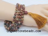 Details: Hand-knotted jasper mala necklaces: 108 8mm/10mm round picasso jasper beads with 1 12mm guru bead and satin tassel (you can choose different colors) Item: GMN709 Material: No.1: 108 8mm picasso jasper beads, 12mm guru bead & satin tassel No.2: 108 10mm picasso jasper beads, 12mm guru bead & satin tassel Color: See image Length (inch): Necklace length: No.1(8mm: approx 38 - 41 inches (Not including guru bead & tassel) No.2(10mm: approx 47 - 50 inches (Not including guru bead & tassel) Tassel Lenght: 7cm Quantity Discount Pricing: 1 – 4: None 5 – 49: 95% 50 – 99: 90% 100+: 85% This mala is available in both 8mm and 10mm beads, The listed price is for 1 piece 8mm mala necklace