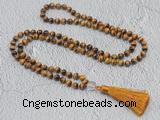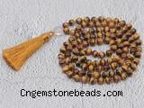 Details: Hand-knotted tiger eye mala necklaces: 108 8mm/10mm round grade AA yellow tiger eye beads with 1 12mm white crystal guru bead and satin tassel (you can choose different colors) Item: GMN741 Material: No.1: 108 8mm yellow tiger eye beads, 12mm white crystal guru bead & satin tassel No.2: 108 10mm yellow tiger eye beads, 12mm white crystal guru bead & satin tassel Color: See image Length (inch): Necklace length: No.1(8mm: approx 38 - 41 inches (Not including guru bead & tassel) No.2(10mm: approx 47 - 50 inches (Not including guru bead & tassel) Tassel Lenght: 7cm Quantity Discount Pricing: 1 – 4: None 5 – 49: 95% 50 – 99: 90% 100+: 85% This mala is available in both 8mm and 10mm beads, The listed price is for 1 piece 8mm mala necklace