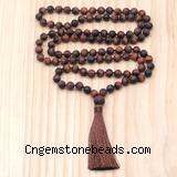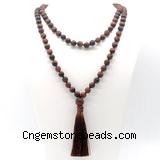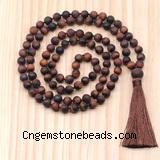 Details: Hand-knotted gemstone mala necklaces: 27/54/108 8mm/10mm round matte red tiger eye beads & 12mm matte red tiger eye guru bead with satin tassel